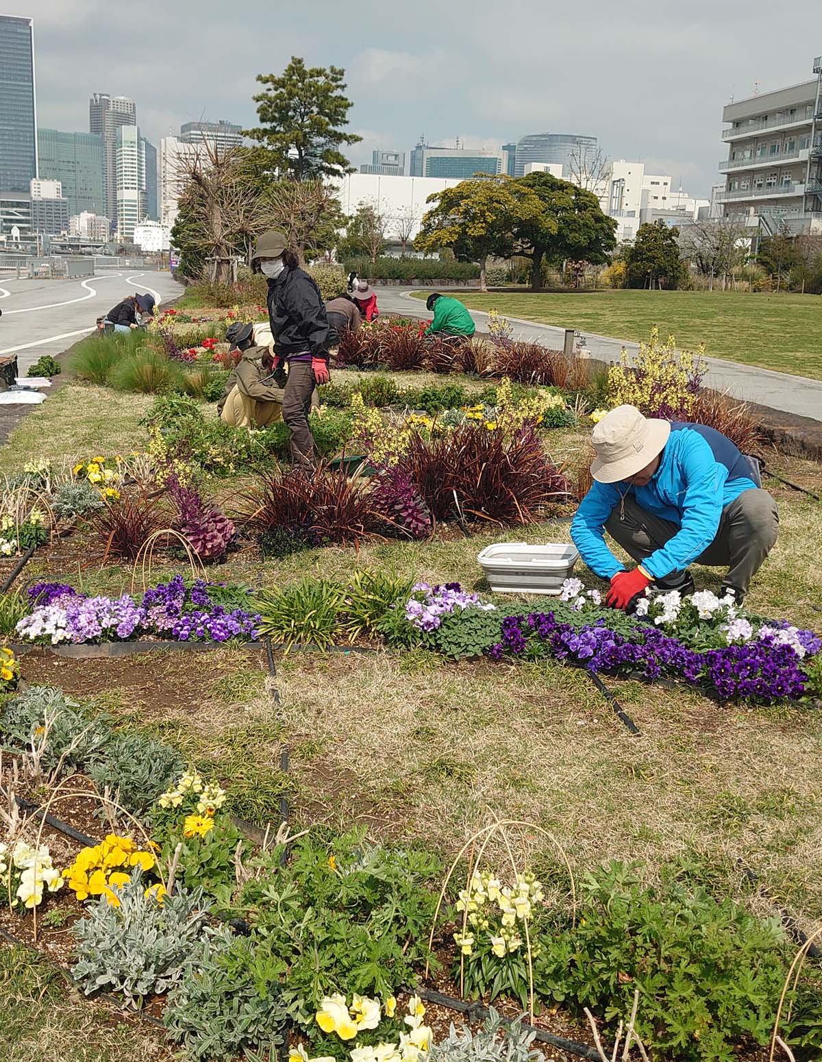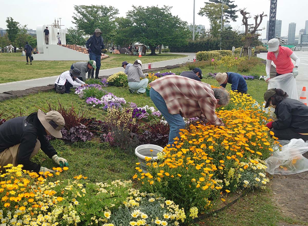 【4月】 これまで花壇ボランティアに参加されていた晴海フラッグ在住の皆さんに加え、新たなメンバーも迎え、今年度の活動がスタートしました。来月の改植まで花が長く楽しめるよう、花がら摘みを行いました。