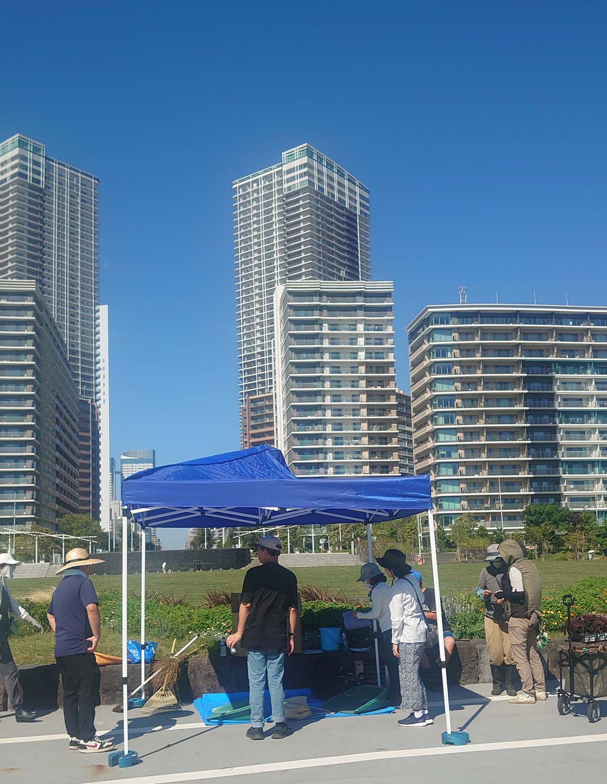 【7月】 9月までは作業時間を午後に変更し、テントも登場しました。傷んだ部分には花苗を追加しました。午後でもまだ暑さは残りましたが、東京湾から吹く海風が心地よく感じられました。