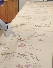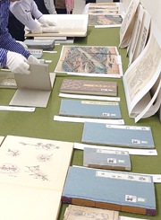 はじめに、それぞれの資料について、筆者や描かれた植物についてなど詳しく紹介、解説をいただきました。そのあと各自自由にご覧いただきました。昔も今も「春」と言えば「桜」。桜を描いた図譜や絵巻がいくつもあり、どれも圧巻でした。また、NHK大河ドラマ「べらぼう」の舞台、吉原の春を描いた有名な浮世絵「東都名所 新吉原五丁目 弥生花盛 全図」の実物を間近で見られ一同大興奮!連動企画の「べらぼうな花たち」にご出演中の小笠原誓さん、主人公の蔦重こと蔦屋重三郎の処女作「一目千本」の現物も特別に見せてくれました。
