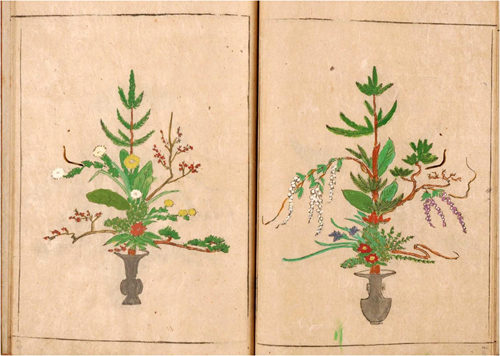 天和四年春芳節 尋旧子 とあり、図に見る活花のデザインもさることながら、花材の豊富さ、外来植物、品種の発達など多くのメッセージが伝えられ園芸的にも貴重な資料である。