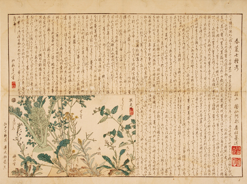 図(一) には 水斳せり、薺なづな、蘩縷はこべら、鼡麹草こぎやう、黄瓜莱たびらこ、菘すすな、莱 すずしろ。