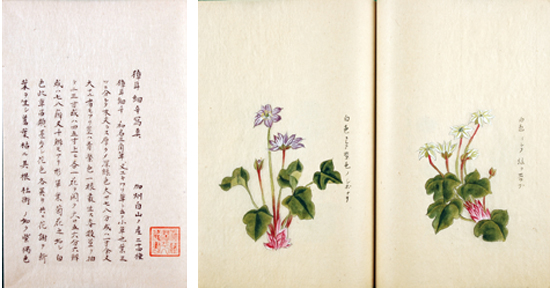 さて本書には著者名、成立年代、序文跋文などはなく最初から植物の解説文で始まる。「しょう耳細辛写真(内題か)加州白山ノ産二十四種 しょう耳細辛 和名三角草又ユキワリ草卜云フ小草也 葉三ツニ分レテ末尖ラズ厚クシテ新緑色 大キサ七八分或ハ一寸余又ナル者モアリ 茎ハ青紫色一根叢生ス 春数茎ヲ抽テ 二三寸或ハ四五寸上ニ各一花ヲ開ク 大キサ五六分六弁或ハ七八弁又千弁モアリ 単葉菊花之如シ 白色此草品種甚多シ 花色各異り共二花謝テ新案ヲ生シ旧葉枯ル 其根杜衡ノ如ク紫褐色ナリ しょうハ朝鮮ニテ(ノロ)ト云獣ナリ 其耳二似タル故しょう耳細辛卜云フ」とあり以降に二十四品種の極彩色の図があり杜衡(カンアオイ)の図と解説六種、双葵(フタバアオイ)の図と解説一種の記載で終る。成立年代は天保~嘉永頃と思われる。