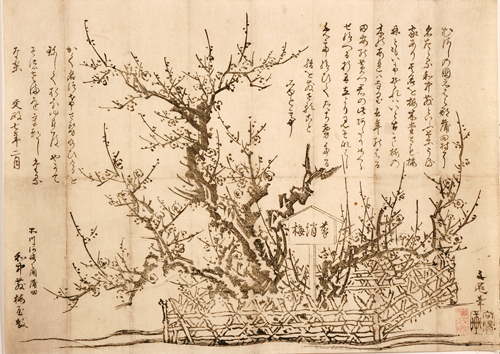 さて文中にある田安の黄門とは即ち、無理に奥州白川藩に養子となった松平定信を指す。彼は三十才で世に謂う寛政の改革を行い五十五才で家督を嫡子にゆづり文学に親しみ、多くの文筆活動を行い、花と芸術を愛した。その定信が、蒲田のこの梅を見物し、名木に名を献じ、親しくしていた当時江戸一番と云れた画家谷文晁に絵画かせた事象を知ることができる。梅の名木にまつわる資料の一つである。