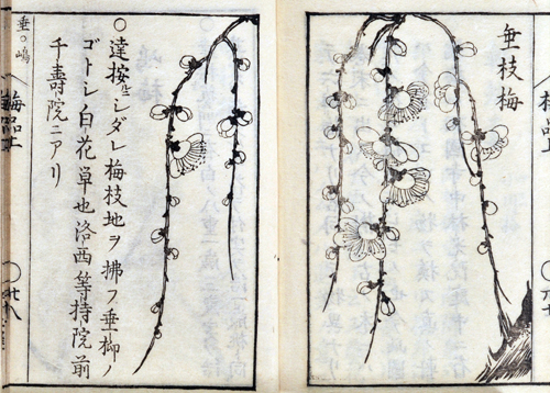 梅譜(中国苑大成著)に曰く 早梅花直脚梅に勝る 呉中春晩に二月始て爛漫独り比、品冬至前に於己に開く 故に名を(以下略)そして、達按るに、早梅信濃梅より花大にして 早開く故に実を結ひ難し 中梅にして白花単弁也 又早梅一種冬咲とて梢に三輪開き 春に至て尽く開くものあり 又群芳謙果部に四月熱するものを早梅と名くとあり 是実の早く熟するを云 梅譜の早梅は花の早く開くを云。