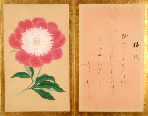 折帖に仕立てられ、見開き左方に花の図、右に品種名とそれを題とした和歌一首が優雅な手で書かれている。