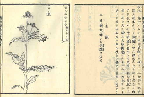 例えば「センニチコウ」は「漢名千日紅四月ノ季」と図中に記し、本文は「千日紅」人家ニ栽テ花ヲ賞ス モト唐種ナリ 春彼岸ノ後種ヲ下ス生ジヤスシ 葉ノ形柿ノ葉ノ如クニシテ細長クヤワラカナリ 長サ三四寸幅一寸許リ対生ス 茎ニ葉付クトコロ太クフクレ淡紅色ニシテ イノコヅチノ茎ノ如シ(中略)夏葉ノ間枝ヲ分チ末ニ一花ヲ着ク 肥タルモノハ三花着モアリ 紅紫色ニシテ細弁ナリ 形ヤマモモノ如クニシテ大ナリ 始メ円ク老ルニ順ヒ漸々長クナリ寸余ニ至ル(中略)一種淡紅花ノモノアリ 又白花ノモノアリ形皆同ジ。