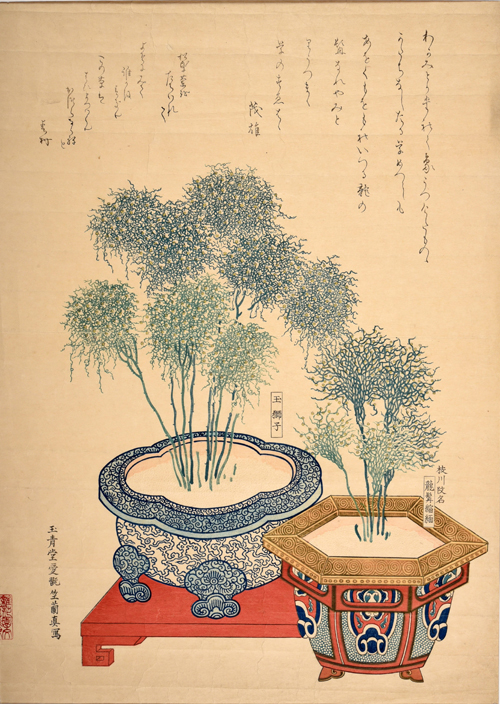 その数寄者の一人、三河国新堀村の富豪、深見延賢、号玉青堂が、江戸で刷らせた「すりもの」が本資料である。図の作者は記載がないが、玉青堂が天保八年に出版した「松蘭譜」の図を画いた、三河の絵師、貫河堂か、江戸の関根雲停あたりであろう。画面左下角に「東都浅倉桜雄刀」とあり江戸の彫師の手になる多色刷大判の版画に仕上げられている。